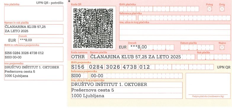 Vzorec obrazca UPN za plačilo članarine. Prosimo prepišite obrazec, za plačnika vstavite svoje podatke ali uporabite QR kodo.