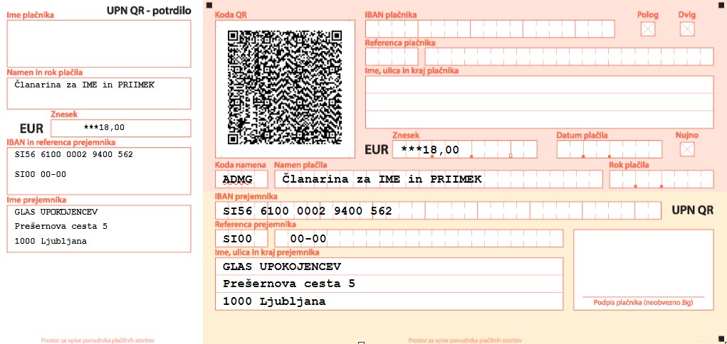 Vzorec obrazca UPN za plačilo članarine. Prosimo prepišite obrazec, za plačnika vstavite svoje podatke.