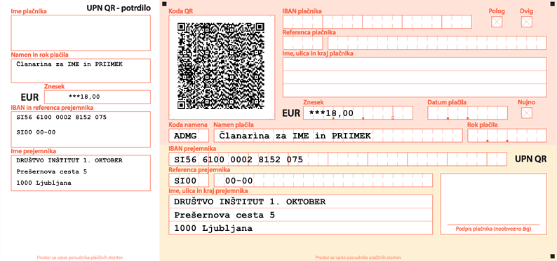 Vzorec obrazca UPN za plačilo članarine. Prosimo prepišite obrazec, za plačnika vstavite svoje podatke.